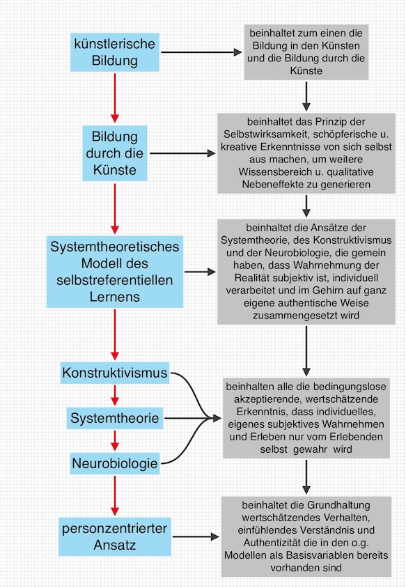 Mittels des systemtheoretischen Modells des selbstreferentiellen Lernens und des personzentrierten Ansatzes kann man herausarbeiten, dass in der kulturellen Bildung durch die Künste, die pädagogische Haltung zum Gegenüber wesentlich ist.